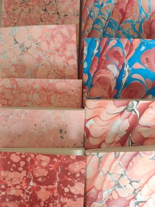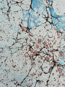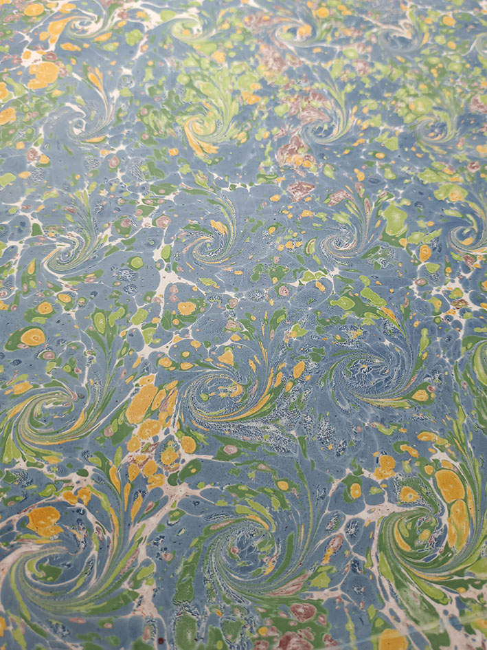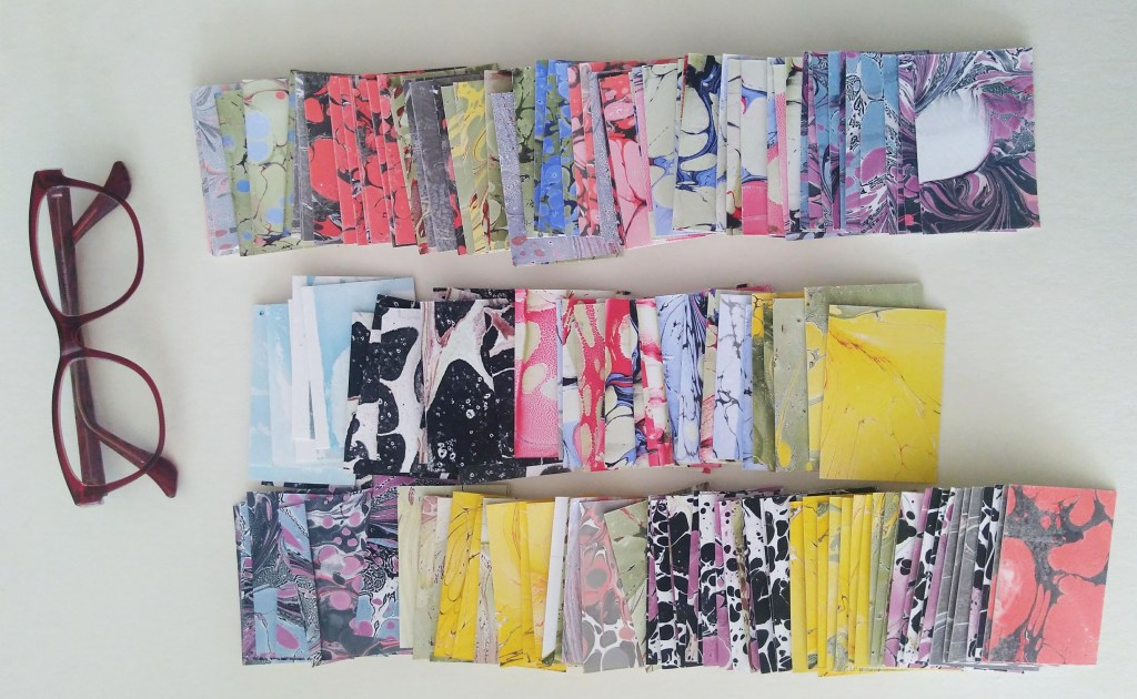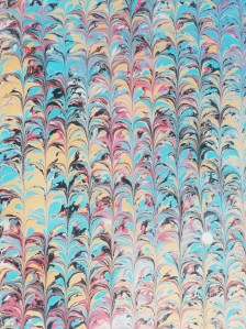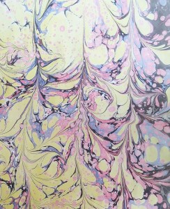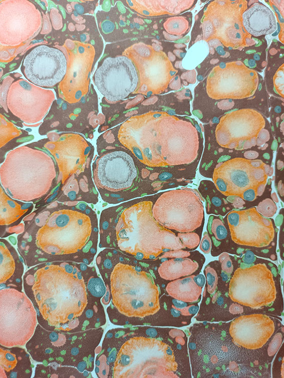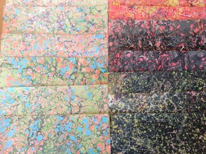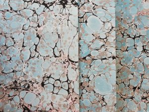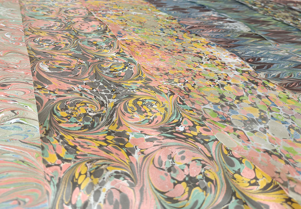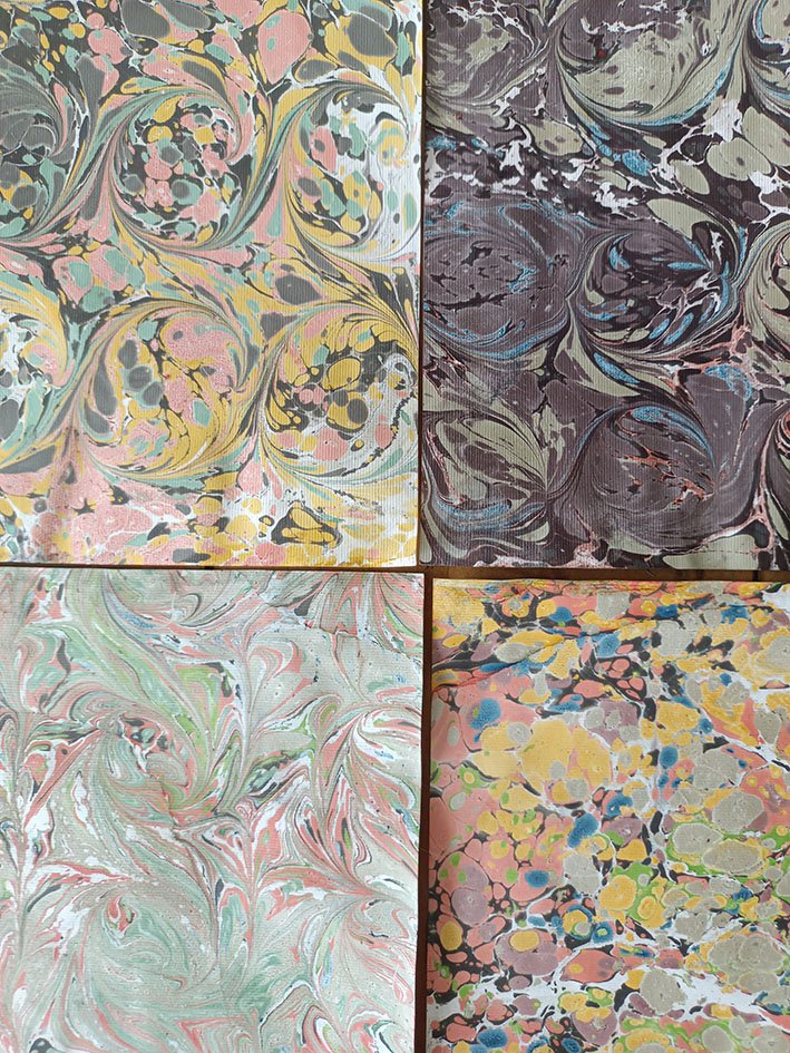 Selección y detalles de papeles pintados, con distintas técnicas: marmoleado, engrudo, trementina y con reserva, que son utilizados dentro o fuera de las encuadernaciones como papeles de guarda.