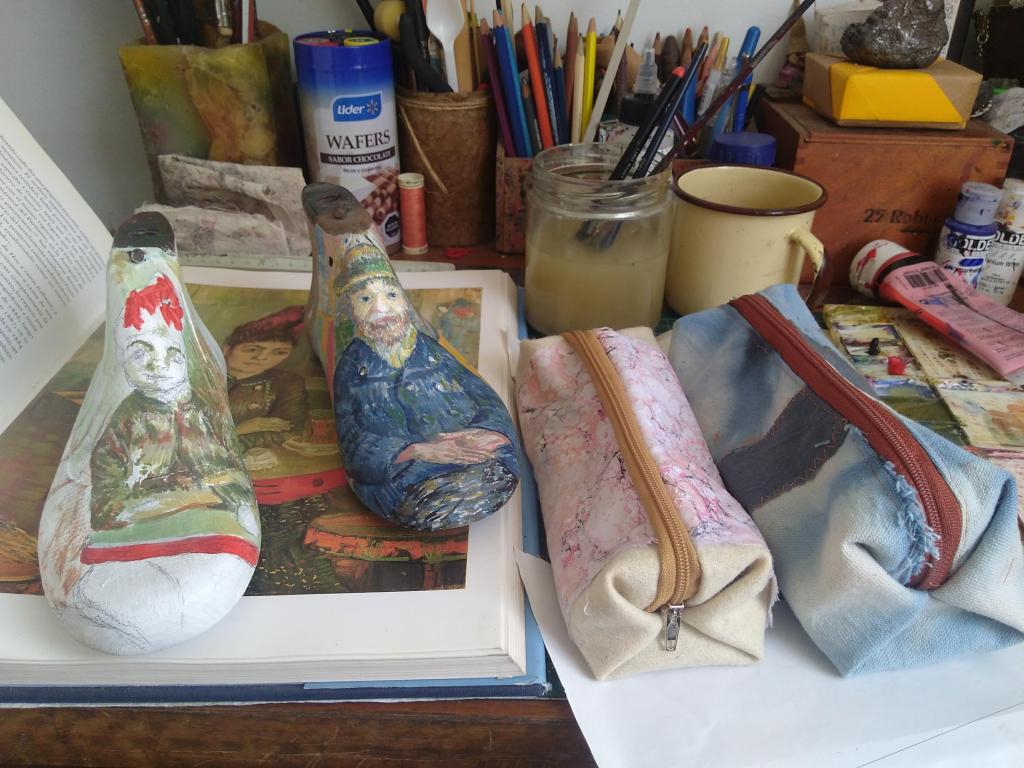 De las cosas bonitas que hice y que me dejaron contenta están unas hormas pintadas, un par de estuches cosidos a máquina, un par de cuadros, los libritos para las estampillas de mi abuelo, un libro que reencuaderné, otros dos pequeños con restos de papel japonés, un estuche de varios trozos de tela para pinceles que le hice a mi hija, unos monos tejidos. Hay 3 libros propios que estoy diagramando y que llevaron años en mi cabeza y la sensación del por fin no tiene mayor palabra que Alivio.