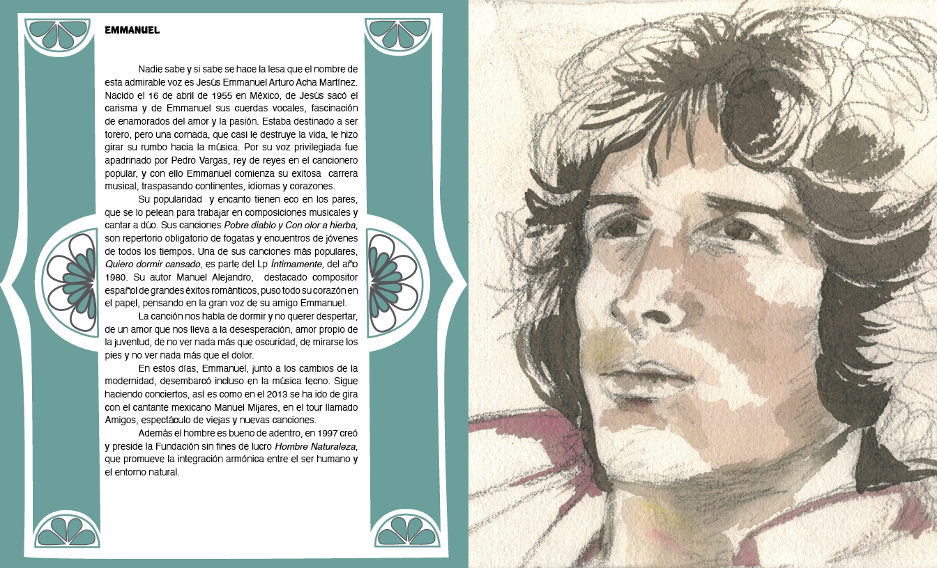 Diseño, diagramación e ilustraciones para agenda 2014 con cancionero popular hispanoamericano de la década de 1970. Seleccioné a 12 artistas más representativos que se escuchaban en Chile en esa década, que es cuando yo nací y escuchaba a diario por la radio que ponía mi madre. Los ilustré y también investigué sus biografías, ademas de efemérides relacionadas con ellos y también con las revistas musicales chilenas y las radios de la época. El texto fue redactado, estilando lenguaje de la época, contando con la colaboración de Claudio Geisse en la edición.
