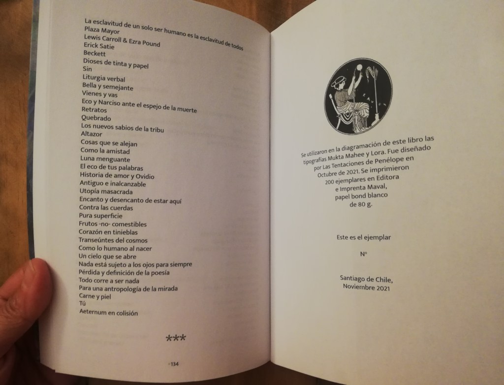 Impresión de 200 ejemplares en Thinkprint, editado por Alberto Moreno, Las tentaciones de Penélope, Santiago Chile.