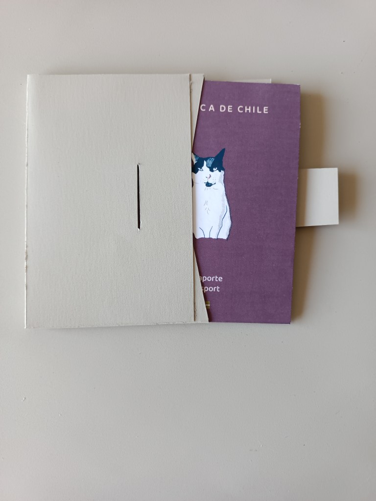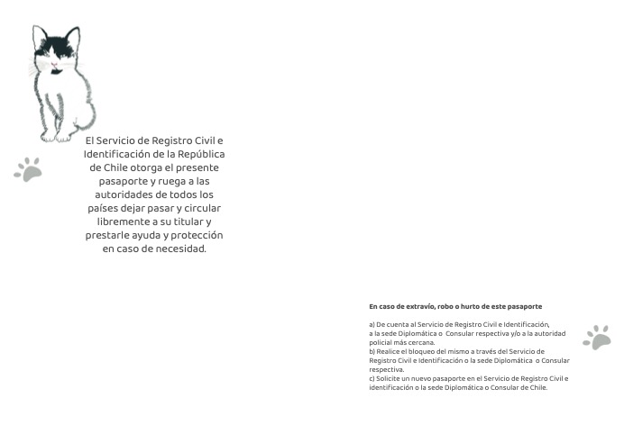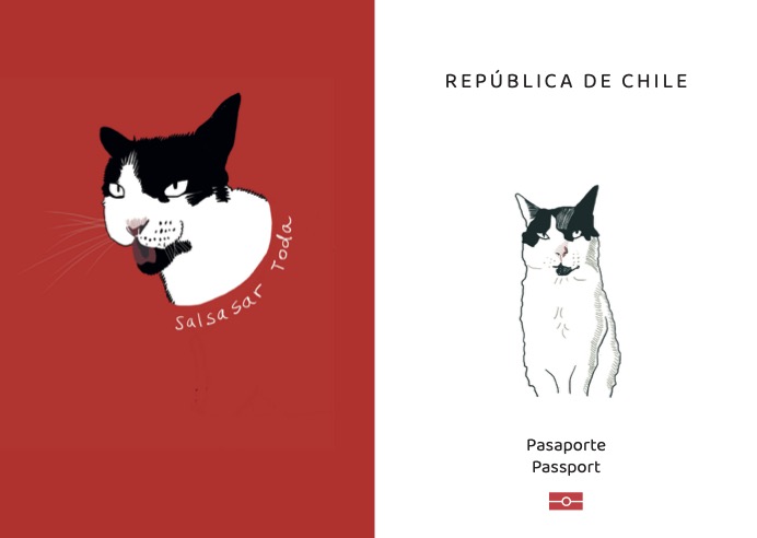 Mi amiga Motoko se fue a vivir a Japón, junto con Salsasar, su gatito chileno y él no tenía pasaporte. Así que me encomendó diseñarle uno para que cruzara por los países y llegar a la ciudad de Okayama, al sur de Japón. Ilustré varias imágenes de Salsasar, Motoko me envió varias fotos. Me basé en el pasaporte chileno y japonés para diagramarlo. La impresión la hizo mi amiga y colega Verónica Garay. Hice un pequeño sobre protector de cartulina. En la aduana de Chile lo timbraron.