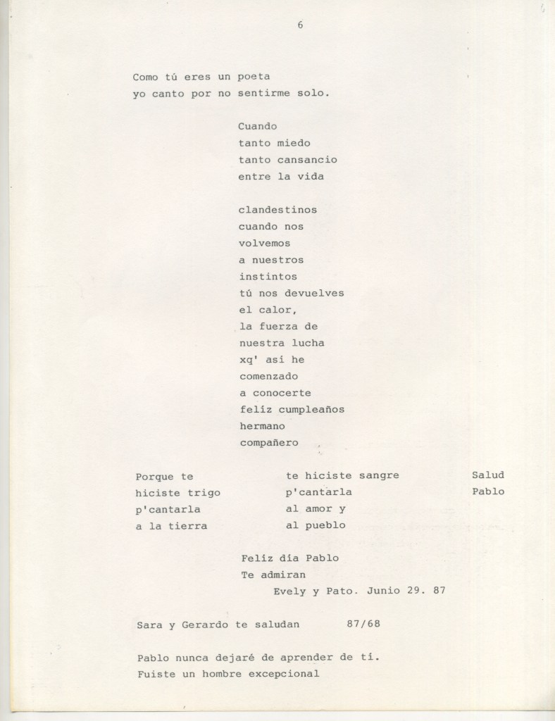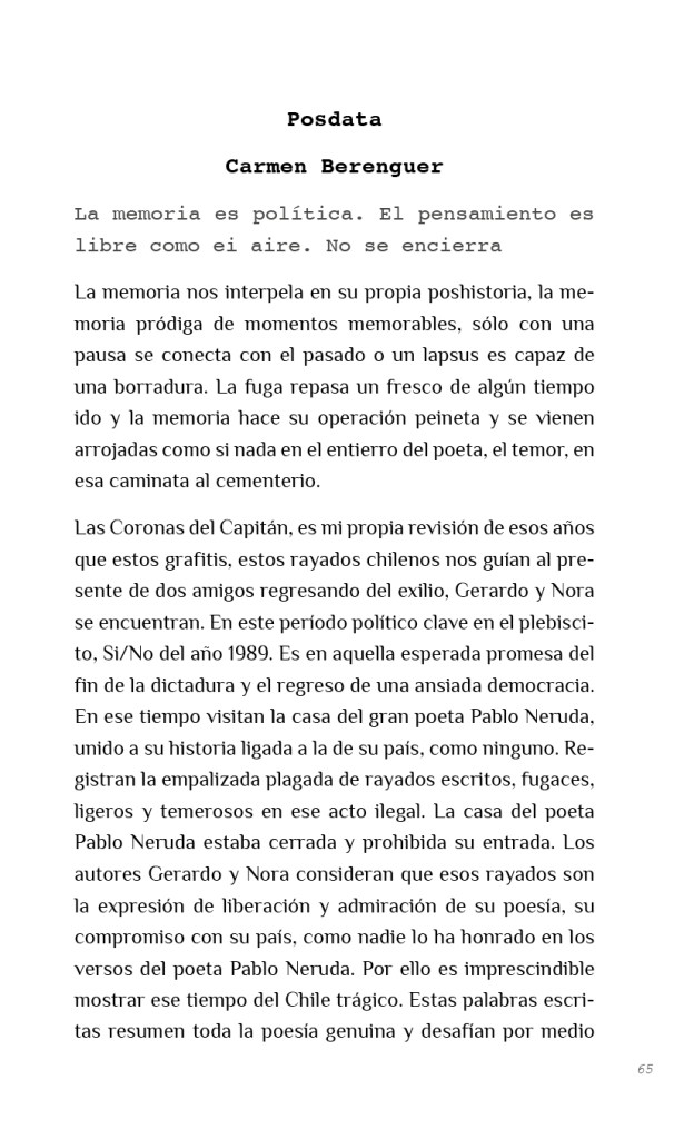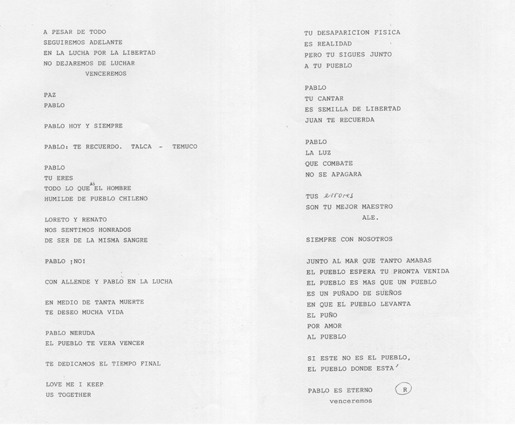 Testimonios y relatos de Gerardo Maldonado y Nora Gatica Krug, chilenos que estuvieron el exilio y que recopiló y transcribió escritos, grafitis, que dejaban los visitantes en las cercas de la casa de Pablo Neruda ubicada en Isla Negra. Además de la diagramación, digitalicé los documentos transcritos. la imagen de portada corresponde a un archivo personal de Gerardo Maldonado.