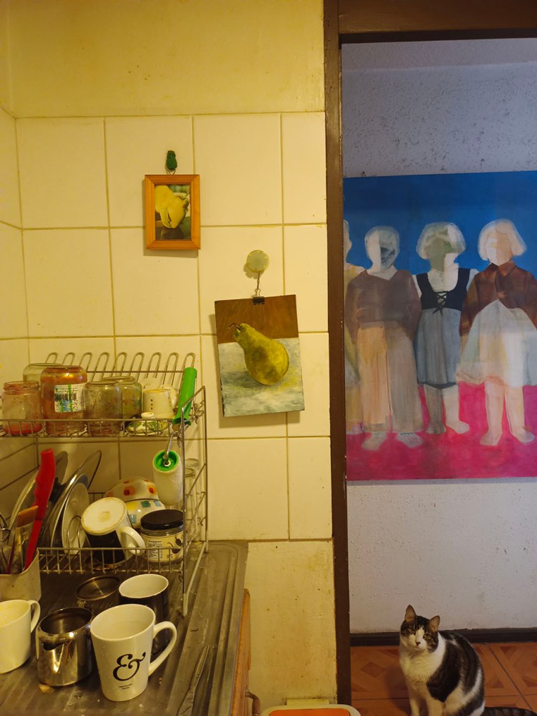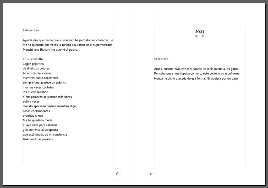 La diagramación la pensé así… Cuando se inicia un año, lo presento con un solo escrito en la página, y bajo el año un filete de dos puntos, después continúa según cantidad de versos, y variará la cantidad de fechas por página. La numeración de páginas están en margen interior. En la portada, utilicé una foto que saqué de la cocina hacia el pasillo de mi hogar, en la pared se ve un cuadro que pinté en el 2022, que se llama Niños Familiares y abajo a la derecha, inmortalizado para siempre, está mi querido Pixie que en paz descansa, exclamando en respuesta a mi pregunta y que seguramente decía ¡Qué se yo!!, o lo que sería mejor ¡Cómo no sabes!