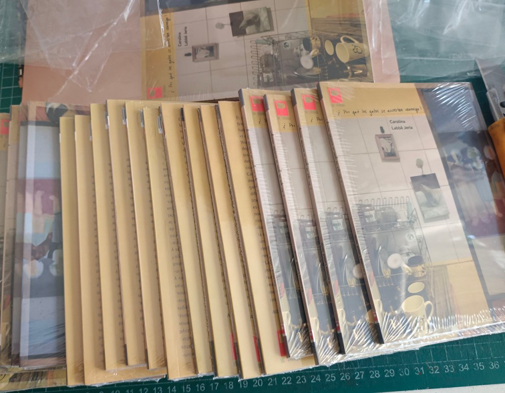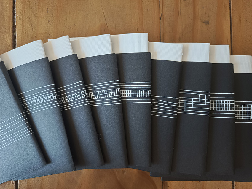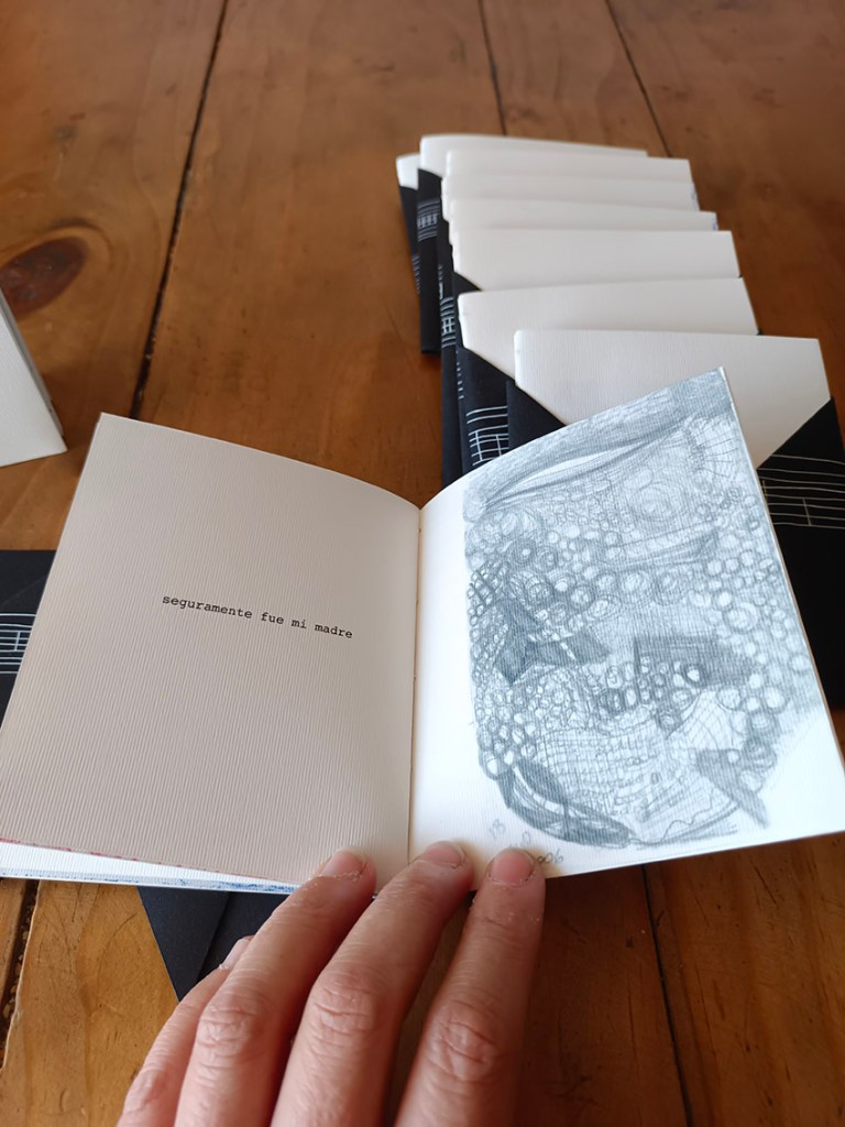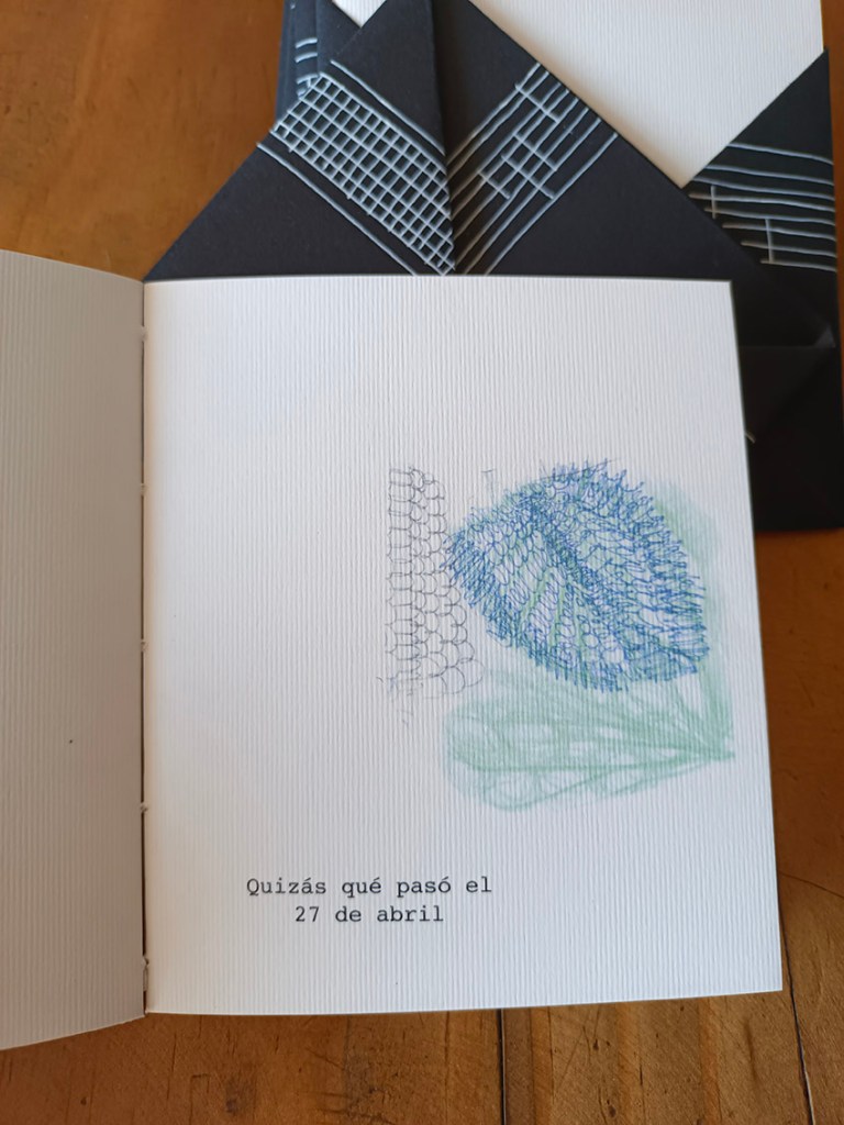 En 2019 hice un único ejemplar y lo regalé a Susana, mi profesora de encuadernación, al segundo año que fui a Madrid para retomar clases con ella. Ahora decidí readaptar ese original en una nueva y pequeña edición, tipo fanzine, de 10 ejemplares. Ahora el formato mide 10 x 11,5 cm. La impresión es a color, los garabatos fueron digitalizados y editados, se hicieron con grafito, crayones y lapiz pasta, tienen pequeños textos que unen la narración gráfica. Los sobres que lo contienen son plegados y están delineados con tinta blanca, a mano.