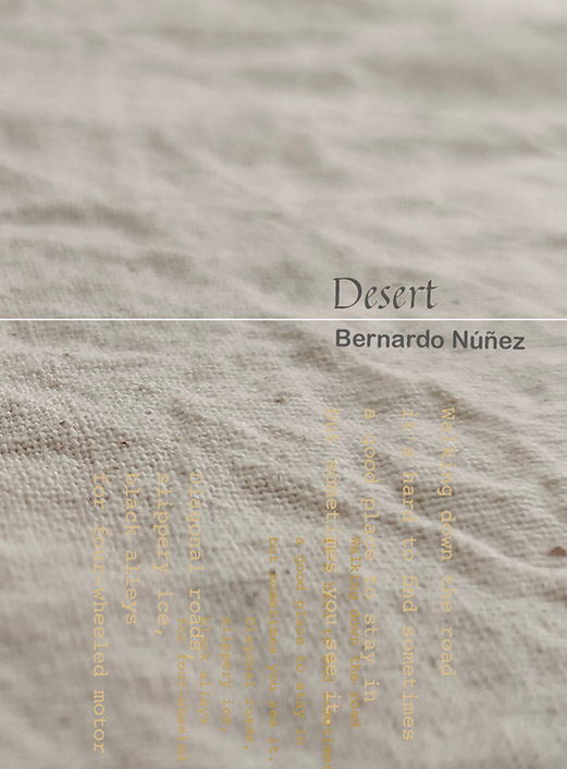 Diagramación poesías y diseño de portadas para 4 poemarios del autor Bernardo Núñez: Hechos, Hunter, Desert y Reflejos. Utilicé para las portadas de 3 de estos títulos, fotografías propias y en Hunter utilicé uno de mis primeros papeles marmoleados, que sentí tenían relación con las poesías de Bernardo.