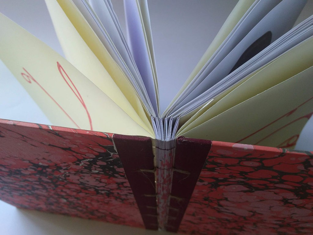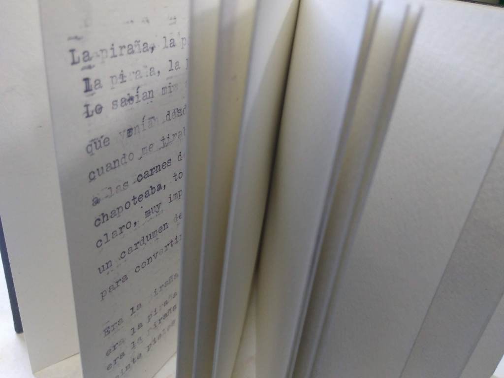 Reuní para este libro las páginas y readapté a un libro formato 14 x 21. La impresora de mi casa arrastra una mancha. La tapa está lijada y rayada con aguja, como pentagramas superpuestos.