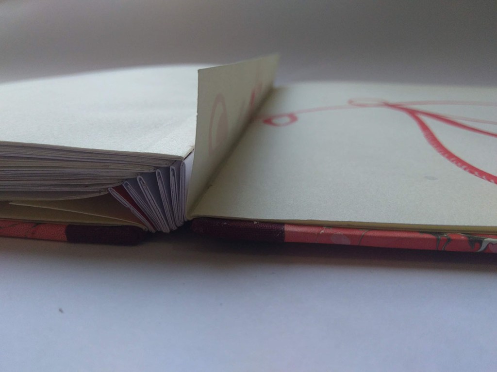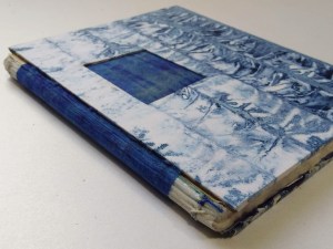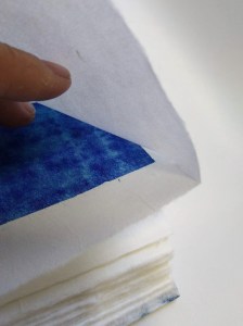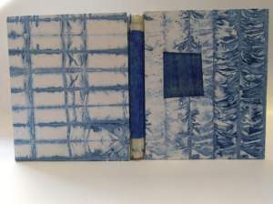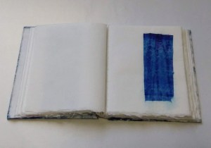 Los introvertidos, a veces dejan entrever, y a mi, cuando me suceden cosas, inevitablemente me repliego. Hice este libro, queriendo hacer algo paralelo con estas situaciones (los pliegues dejan marcas), utilicé en el interior papel japonés, plegado varias veces, y de distinta forma, y con intervención en algunas páginas con papeles teñidos con reserva. La idea era dejar marcado en el papel los dobleces que se hacen en shibori sobre tela y que se llama orizome cuando se aplica en el papel y que los cuadernillos formados al plegar, quedaran en modo intonso, sin guillotinar.