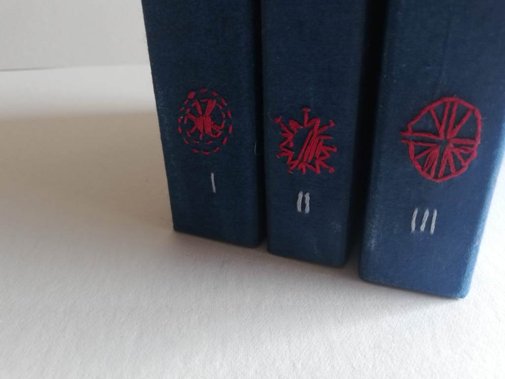 Las encuadernaciones están realizadas en tela crea cianotipada, lomo bordado y doblemente articulado (tue mouche), cuerpo canson edition de 250 g. impreso en su totalidad con emulsiones fotográficas: cianotipia, goma bicromatada, calitipia. Intervención con bordados, páginas desplegables, insertos de tela, sobres (Para ver los libros en detalle, visitar acá).