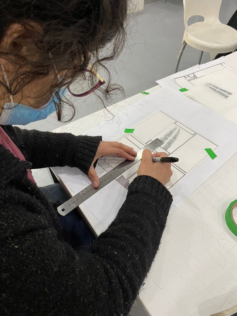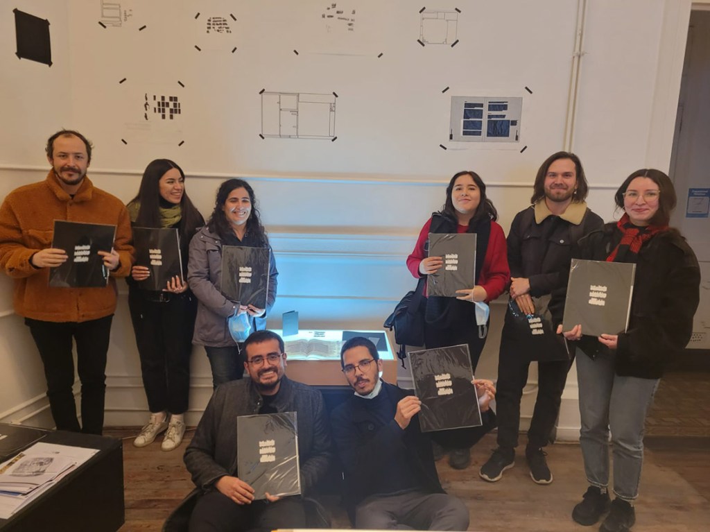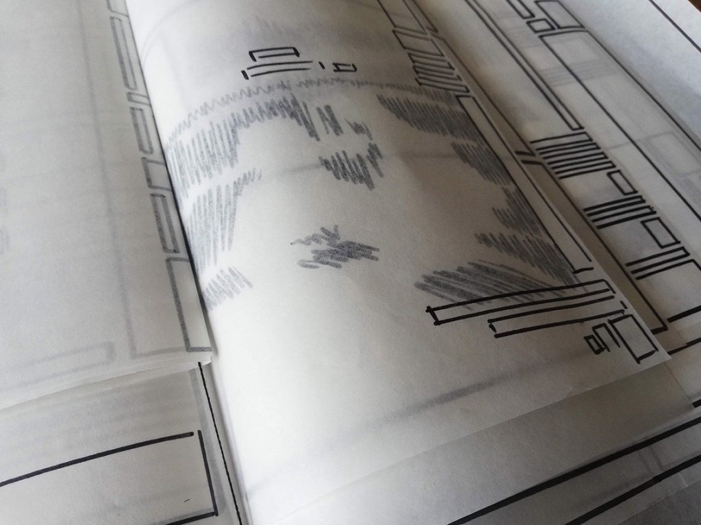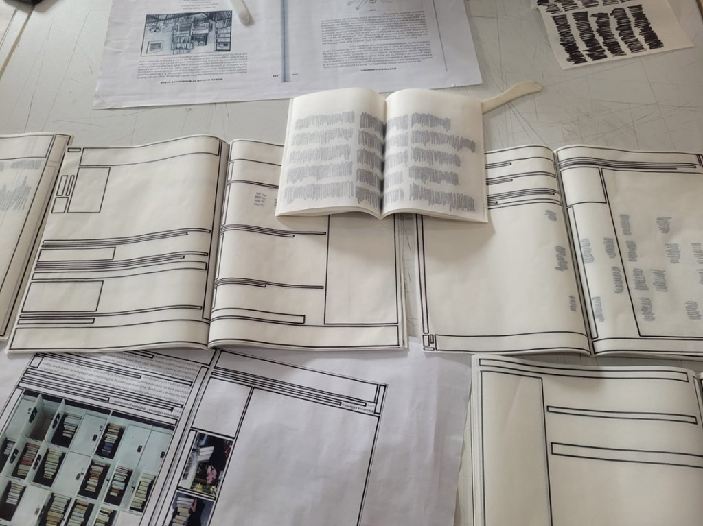 ¿Qué se ve de noche? Se logran ver los libros, qué parte de ellos? Cómo? Cómo traducir los paratextos, que pasa con el vacío? cómo unificar estilo, pero que también se noten las manos, cómo ser grupo e individuo a la vez. Todas esas preguntas nos hicimos. Fueron dos semanas de para ir profundizando y experimentando formas y ponernos de acuerdo en el sistema de códigos a utilizar en los paratextos. Fuimos 7 integrantes y a cada uno nos tocó un par de páginas impresas de libros donde aparecían librerías, libros, bibliotecas, para traducir en papel vegetal. Yo usé la ventana del departamento. Nos reunimos y armamos los ejemplares, realizamos 14 ejemplares en total.