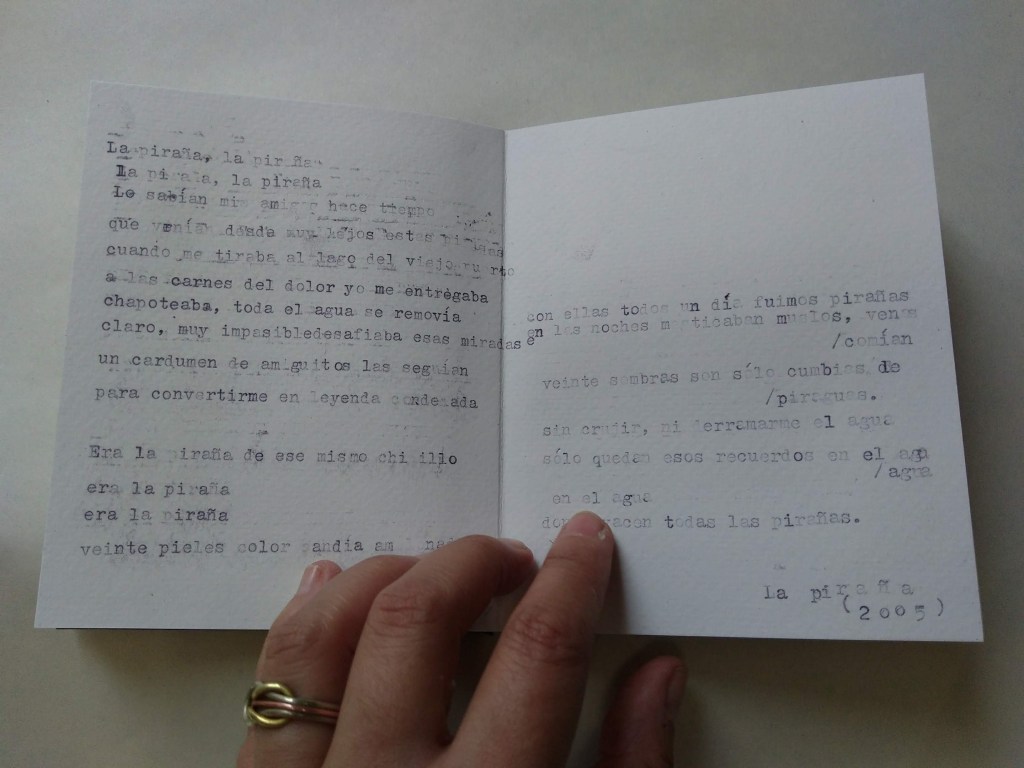 Ocupé la máquina de escribir que era de mi madre, y que la ocupé tanto mientras estaba estudiando en el colegio. Me la regaló hace tiempo y volví a utilizarla. En ciertas letras tendía a correrse la tinta. Escribir con esa máquina, mancha la hoja, y me parece un recurso gráfico que acompaña estos poemas que transcribí a papel, creados en el 2005-2012 y 2015.