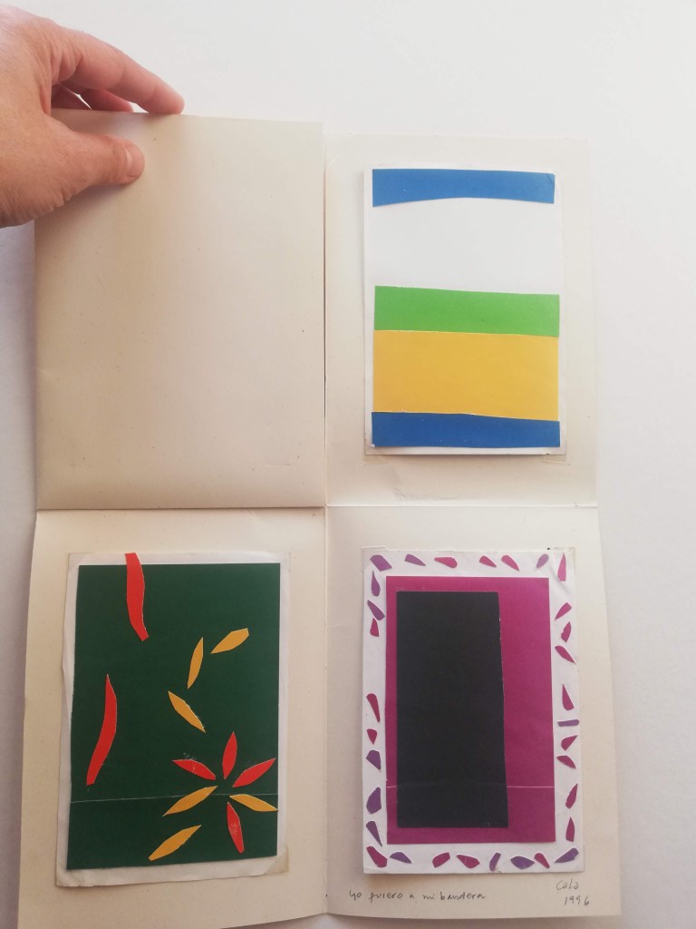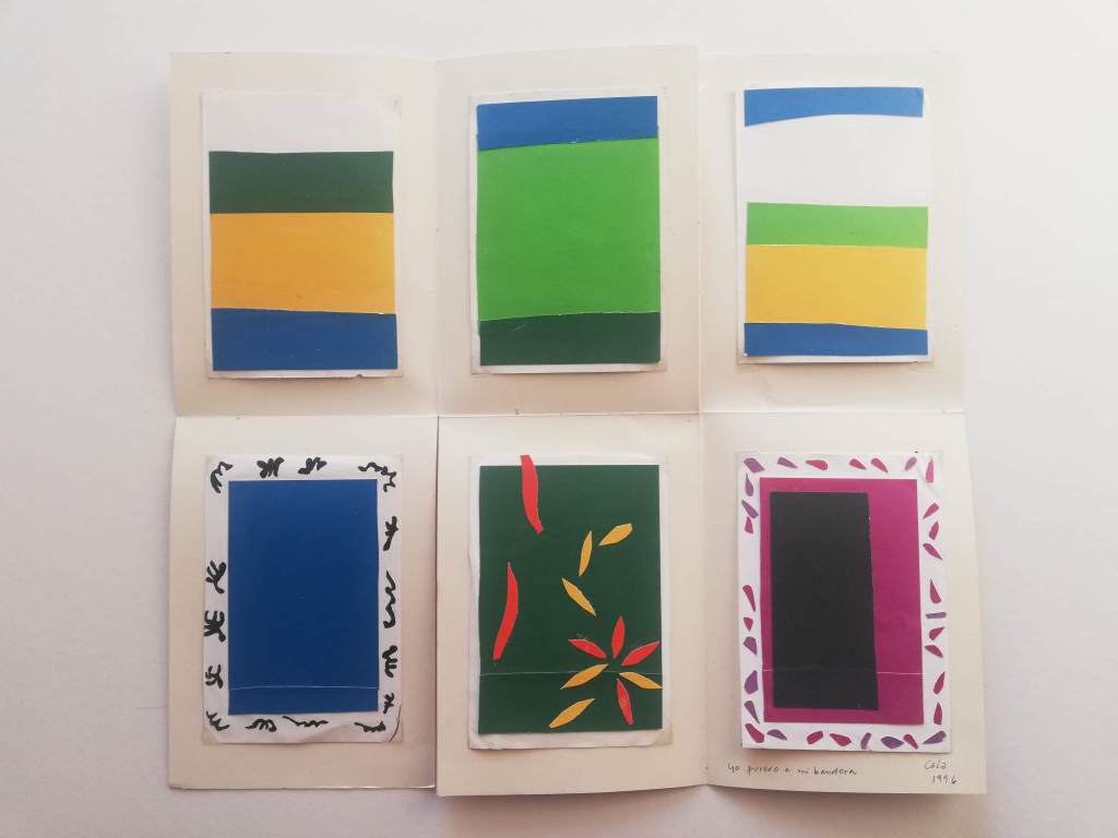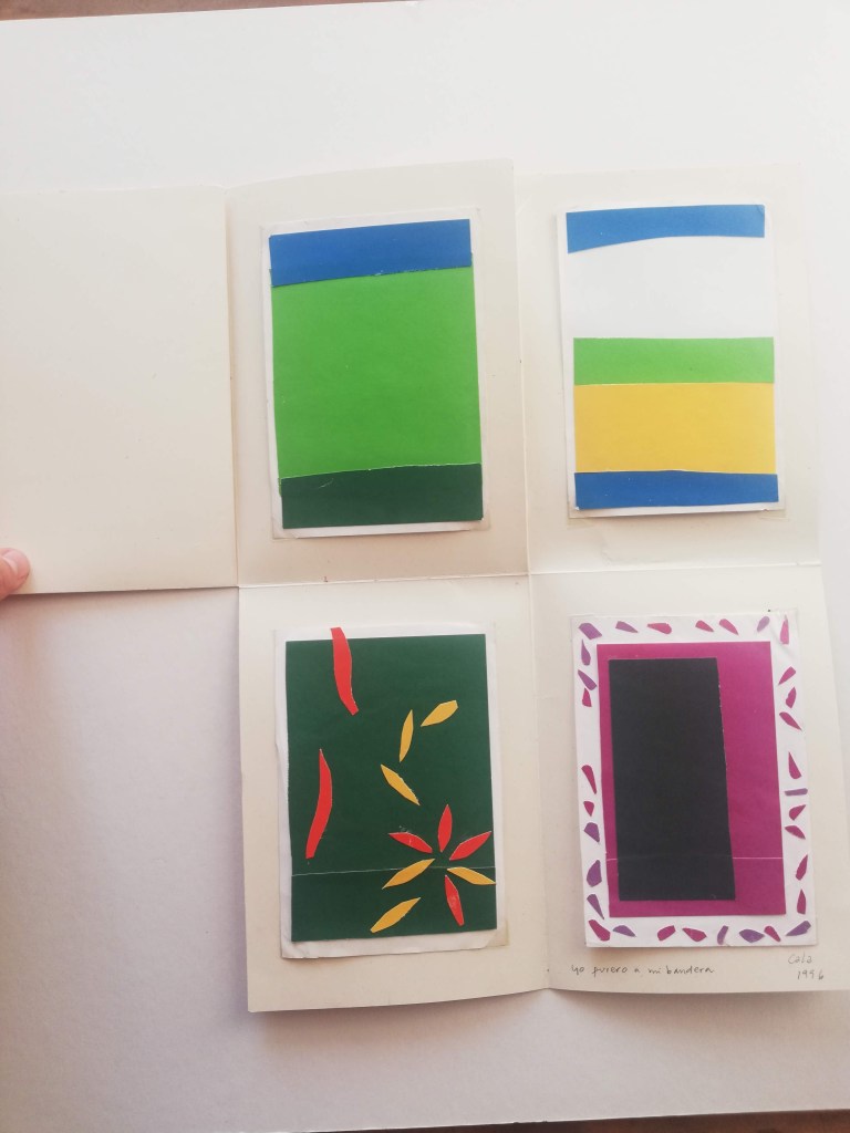Desplegable, de un conjunto de postales recuperadas de un ejercicio de Taller mientras estudiaba Diseño en 1996. Elegir una bandera propia, adoptando a un artista. Yo elegí a Matisse. Cada prototipo de bandera está hecha con papeles recortados. El título hace alusión a una canción del mismo nombre, de Sumo, grupo argentino década de los 80 y que dice :