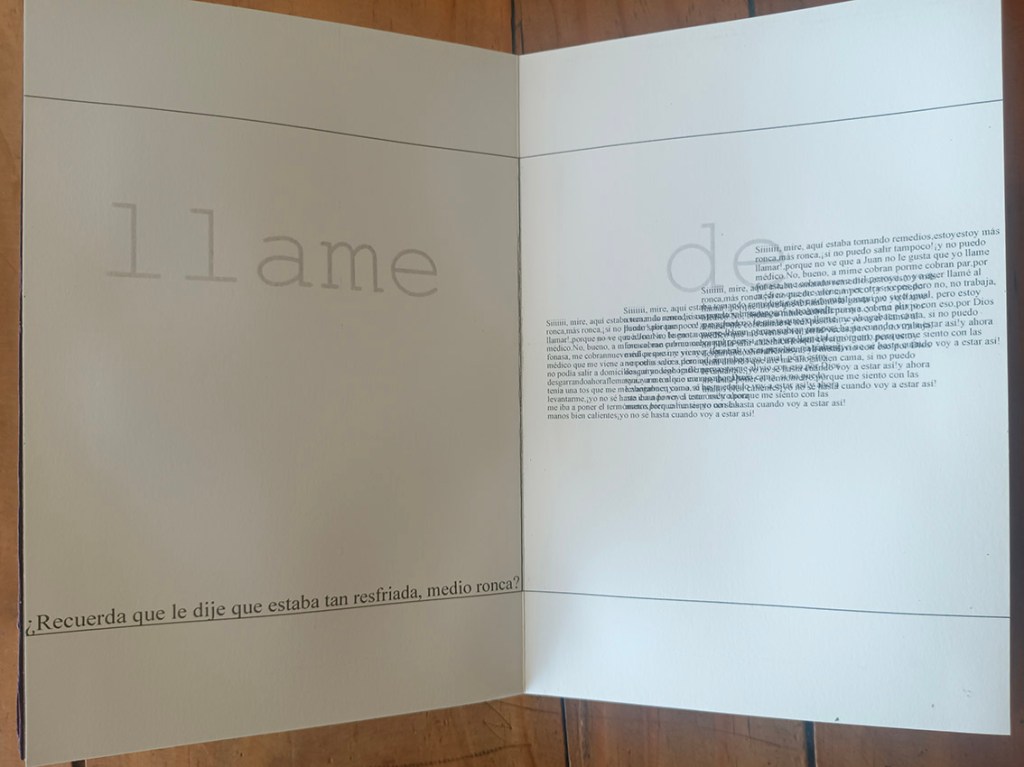 La letanía como concepto del querer ser escuchado, consiguiendo lo contrario. Para el desarrollo de la obra, entregué diferentes obras para los artistas docentes del Diplomado, para el taller con Arturo Duclós, realicé una presentación en ppt, en el curso de Rainer Krause propuse una carátula de disco, hice un registro fotográfico para el curso de Enrique Zamudio, y para la presentación final del Taller con Nury Gonzalez un manifiesto de las letanías de mi abuela en hojas impresas pegadas a la pared. Este manifiesto contiene los textos de estos monólogos de ella hablando de su deteriorada salud, su continua queja , quedan reflejadas en textos superpuestos y desplazados, que finalmente quedan confusos, entremezclados, sin poder oírse con claridad. Las fotografías hablan de ella a través de su entorno y objetos cotidianos.
