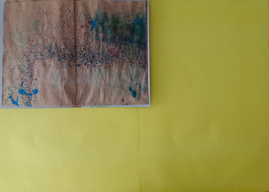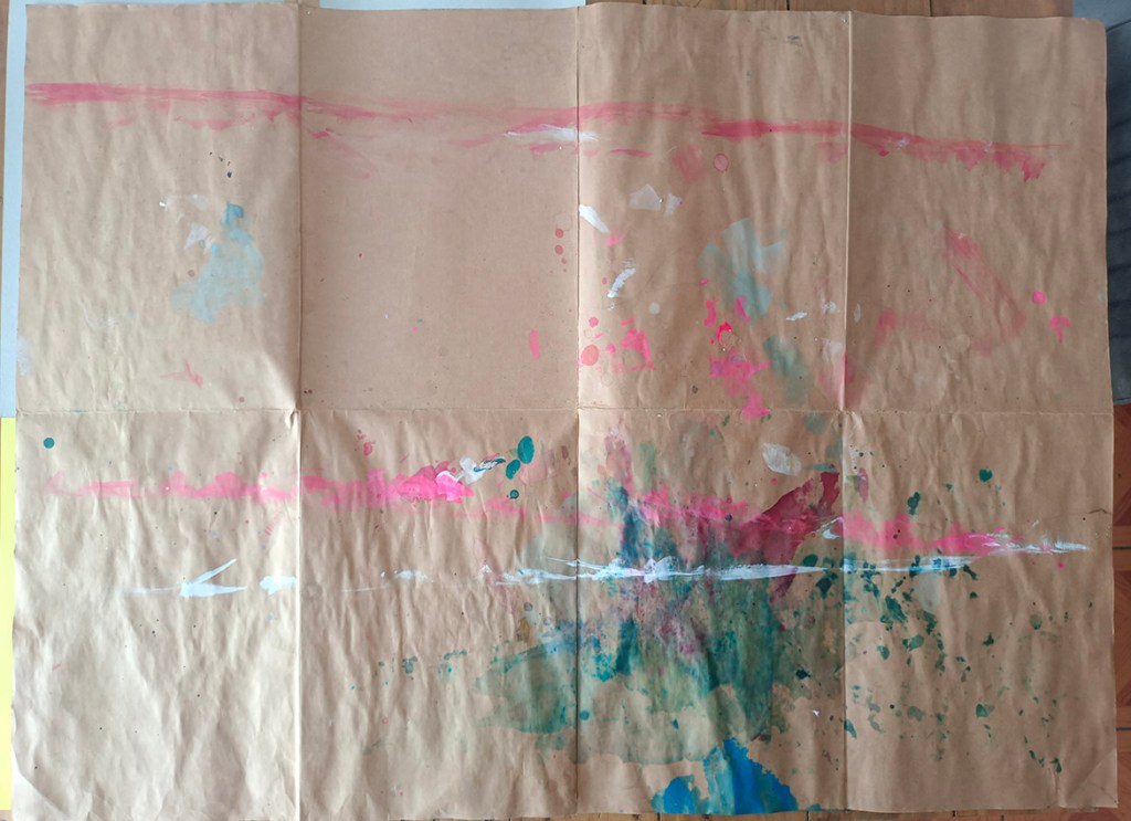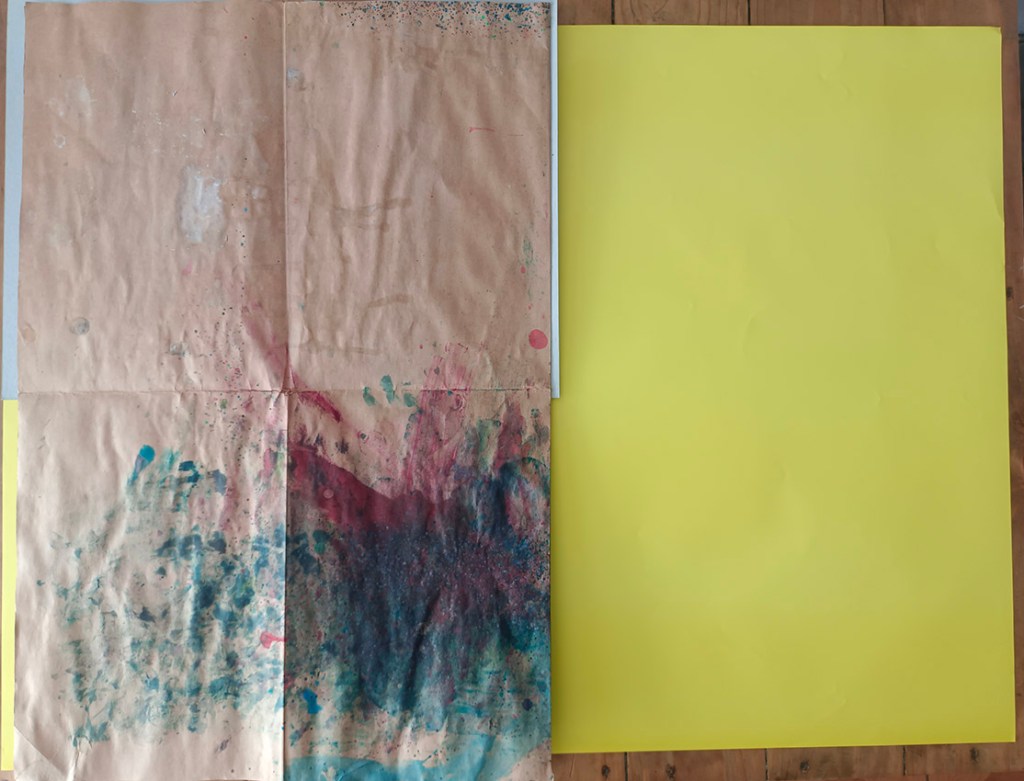Las tapas son de cartón y el desplegable es un papel Kraft que usé de sobremesa, que registró manchas cuando pinto y hago papeles marmoleados y cuando preparo pinturas, las últimas manchas, antes de convertirlo en carpeta, son cuando preparé botellas de anilinas al alcohol.