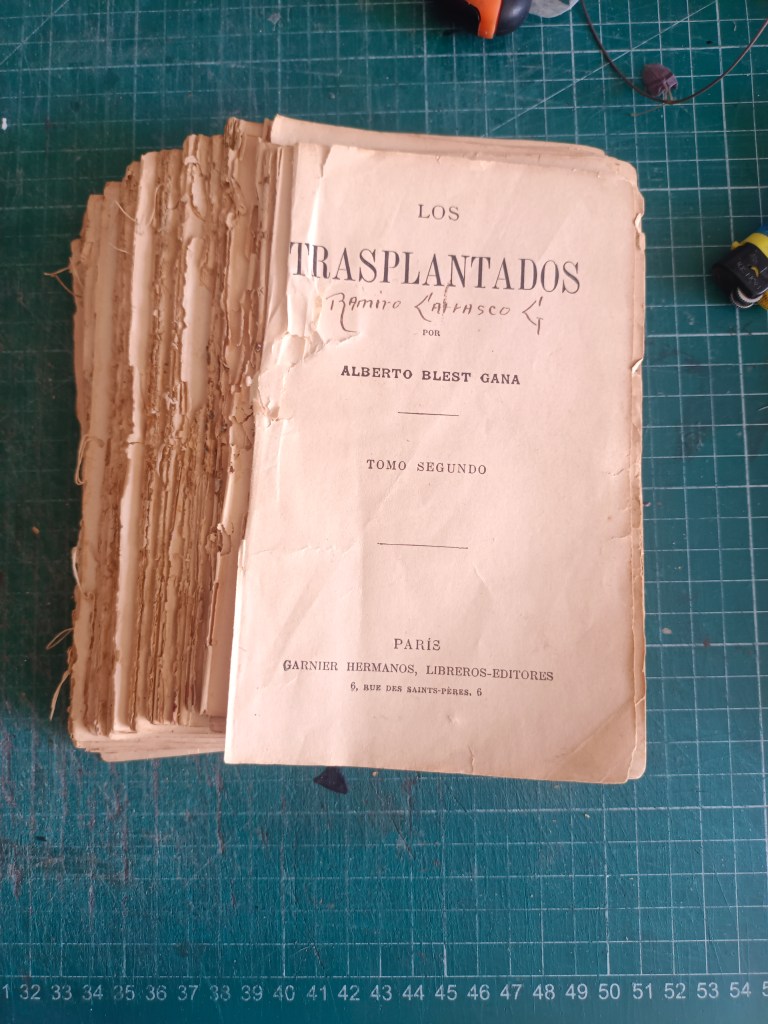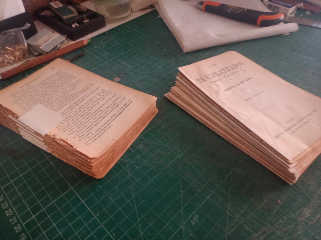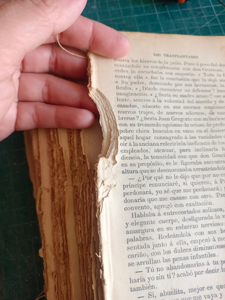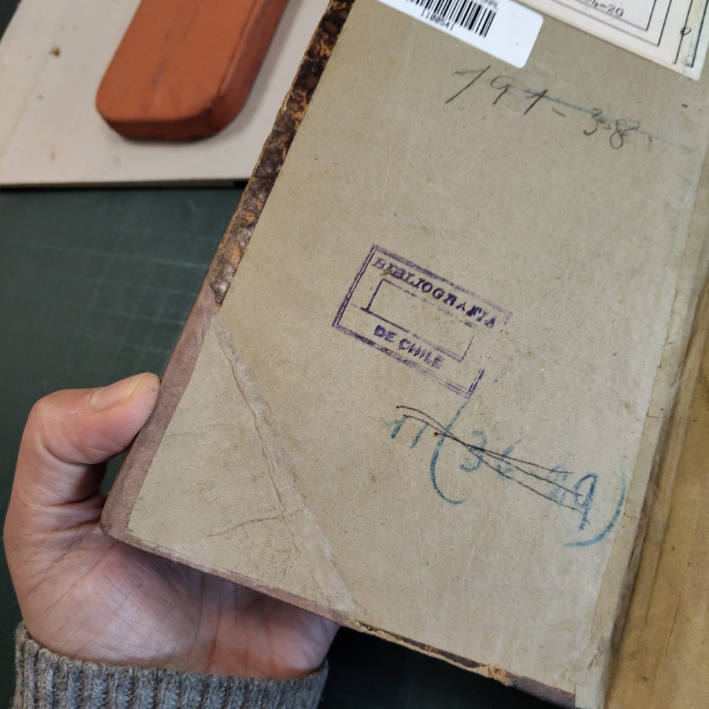 Reparación y encuadernación. El libro venía con la tapa recortada pegada en una hoja de cuaderno y suelta, como camisa. El cuerpo casi completo venía intonso, se leyeron o fue abierto en pocas páginas. Algunos pliegos estaban semiabiertos en la cabeza de la unión del cuadernillo.