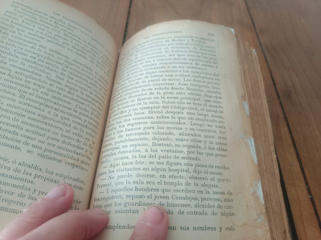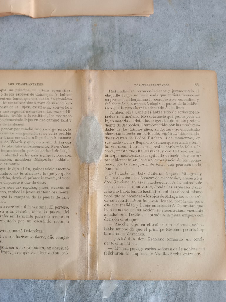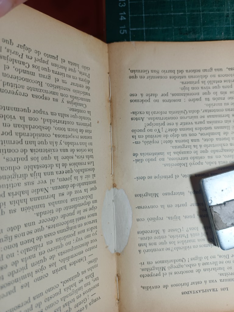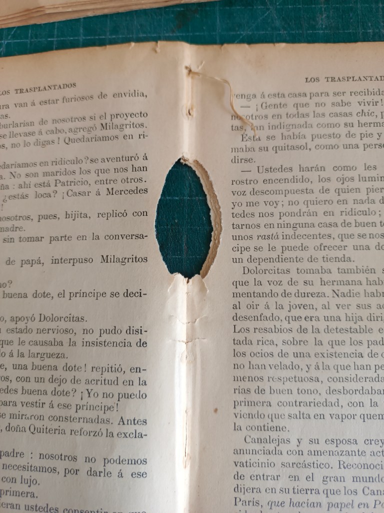 Reparación y encuadernación. El libro venía con la tapa recortada pegada en una hoja de cuaderno y suelta, como camisa. El cuerpo casi completo venía intonso, se leyeron o fue abierto en pocas páginas. Algunos pliegos estaban semiabiertos en la cabeza de la unión del cuadernillo.