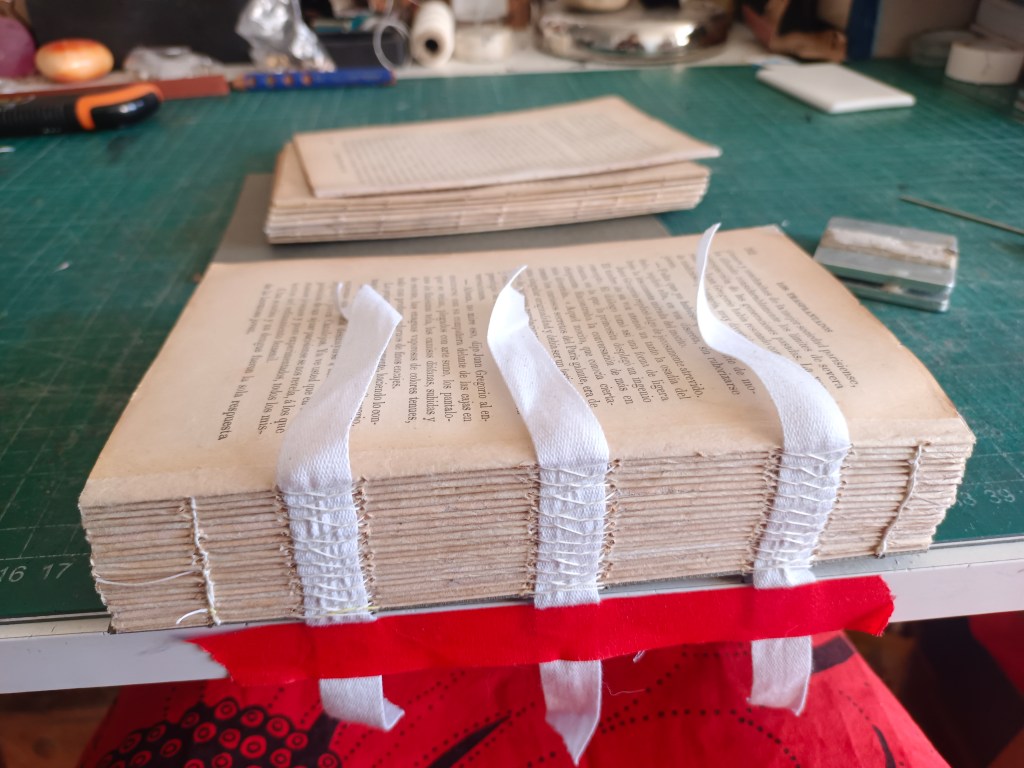 Lo que hice fue despegar lomo y separar cuadernillos, volver a estirar una por una cada esquina mordida, injertar papel japonés en cada una de ellas. Decidí no encolar el lomo y encuadernar con estructura cruzada para conservación, agregué sólo dos estaciones (las cadenetas) para reforzar la costura.