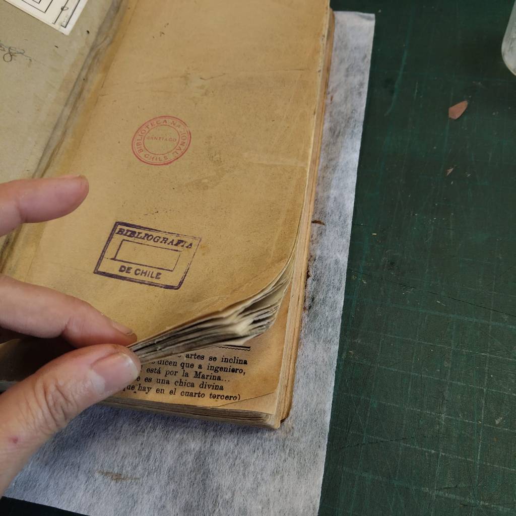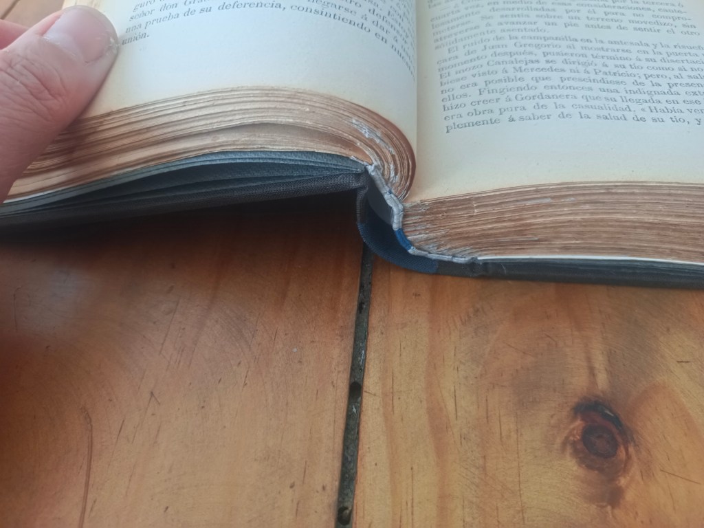 Lo que hice fue limpiar el lomo, utilizar el papel japonés al reforzar bisagras en cuadernillos, laminar portadilla, colocar algunos injertos, volver a redondear el lomo y reforzar su cajo.