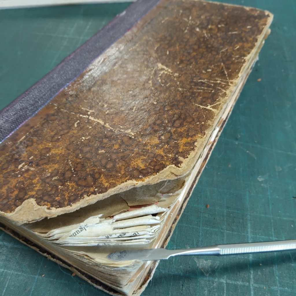 Reparación de unión de cuadernillos con papel japonés, nueva costura, nuevas guardas y nuevas tapas de tela y papel italiano.Tejuelo escrito a mano sobre el reverso del mismo papel con tinta dorada.