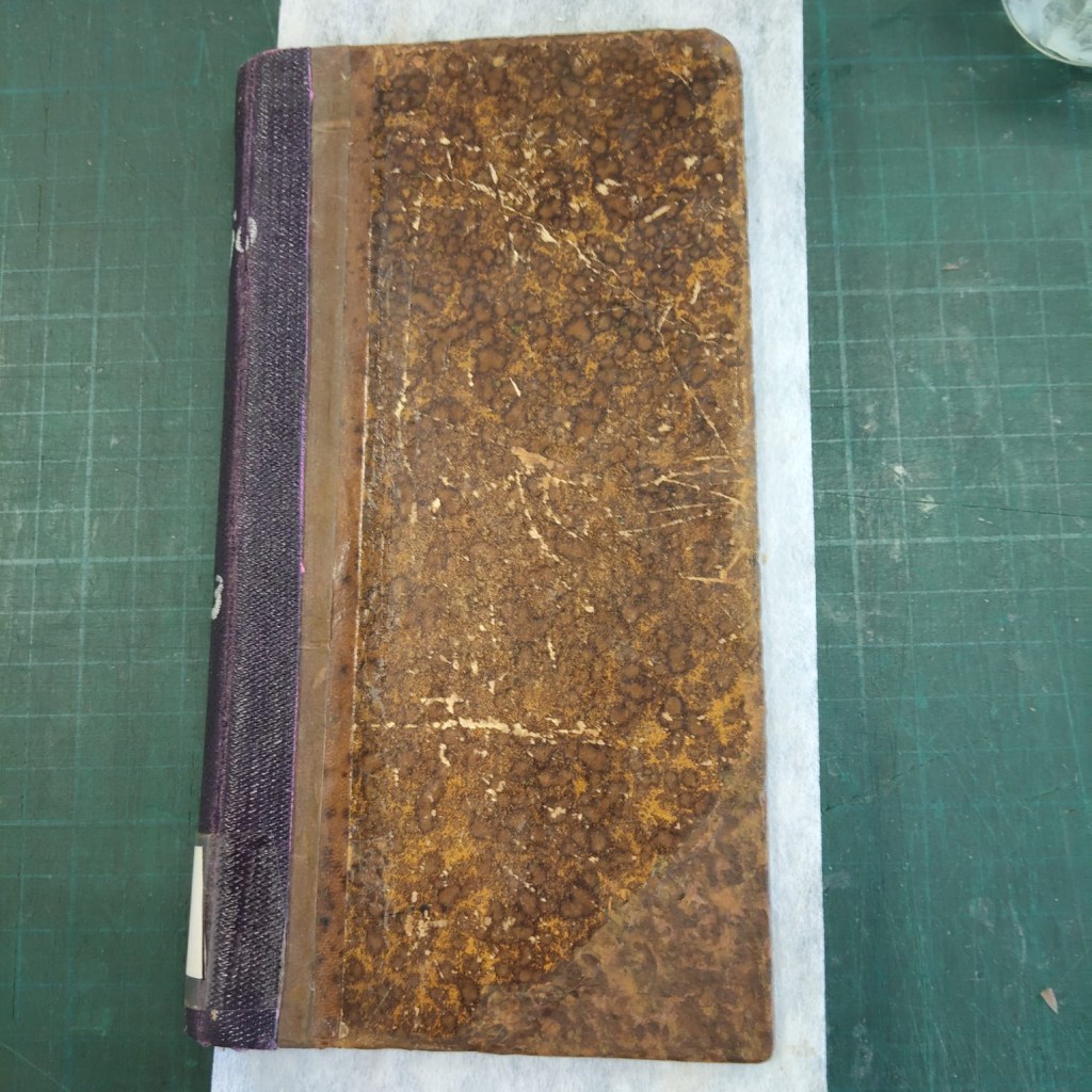 Para tratar de disminuir las arrugas producidas por un derrame de líquidos (quiero imaginarme que alguien bebió café) lavé todas las hojas. Reparé algunas bisagras con papel japonés y formé cuadernillos de los que estaban semiabiertos y el resto los mantuve en intonso.
